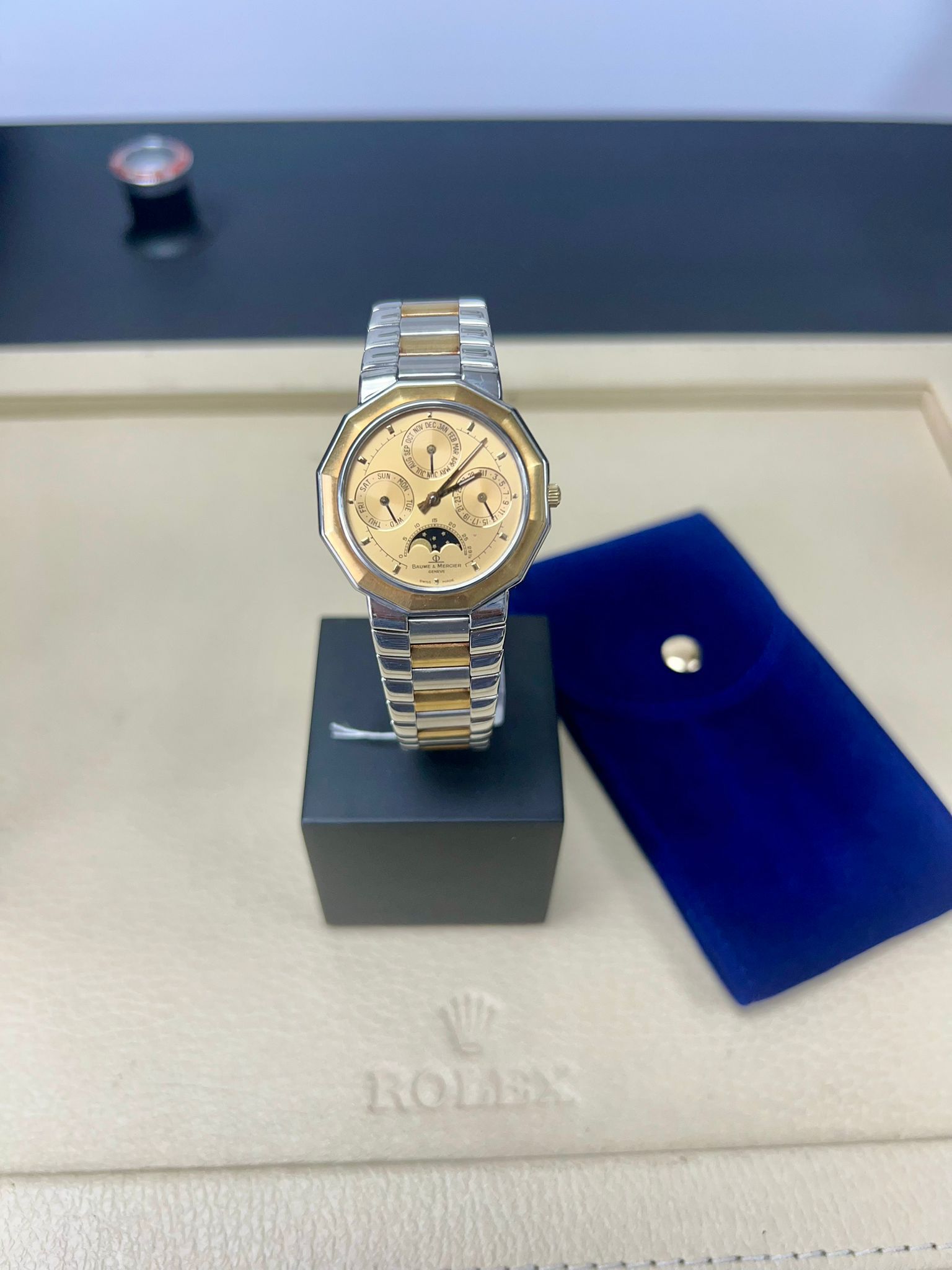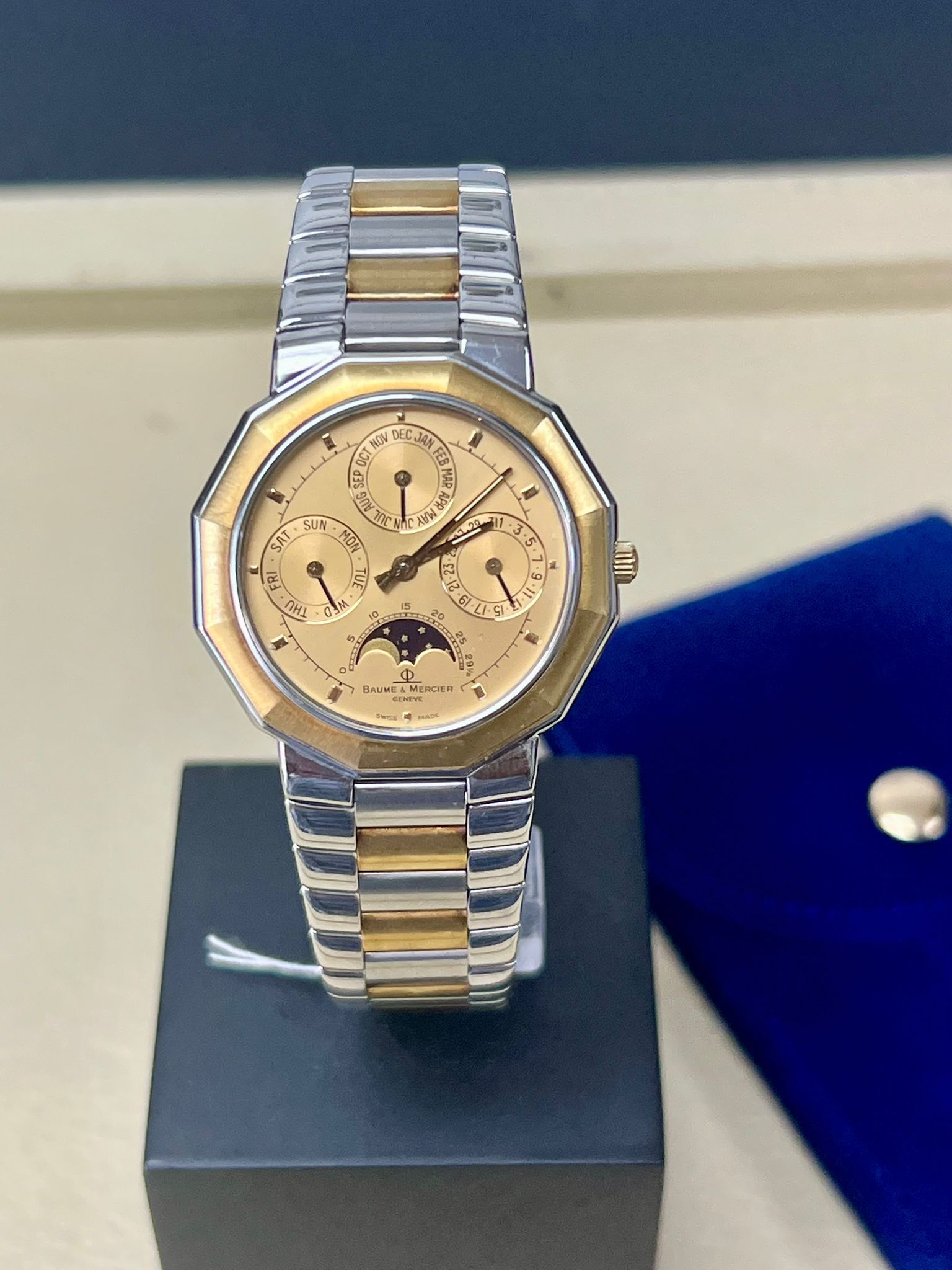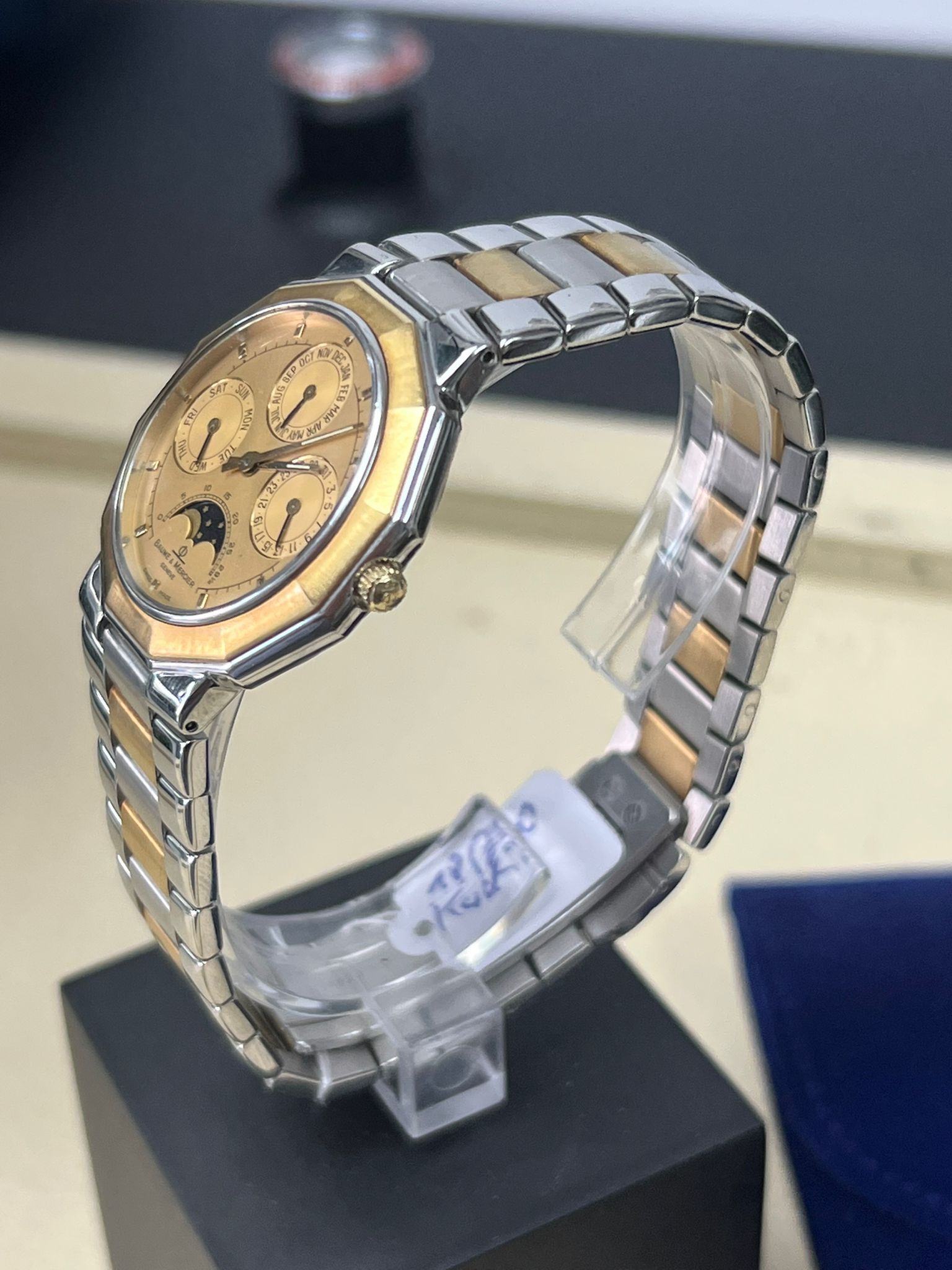 Gehäuse: Edelstahl,Lünette: 18/750 Karat Gelbgold , Armband:Edelstahl/ 18/750 Karat Gelbgold, Ref:6131.038 Serie:MoonfaceTripel Date, Vollkalender,Quarz Kaliber: Wasserdichtigkeit:10 ATM:Saphirglas:Durchmesser: 34mm, die uhr hat eine Revision erhalten und wurde von uns Geprüft, Lieferumfang:Echtheitszertifiat, Datenblatt alle relevanten Daten dokumentiert Preis: 1.850.-€