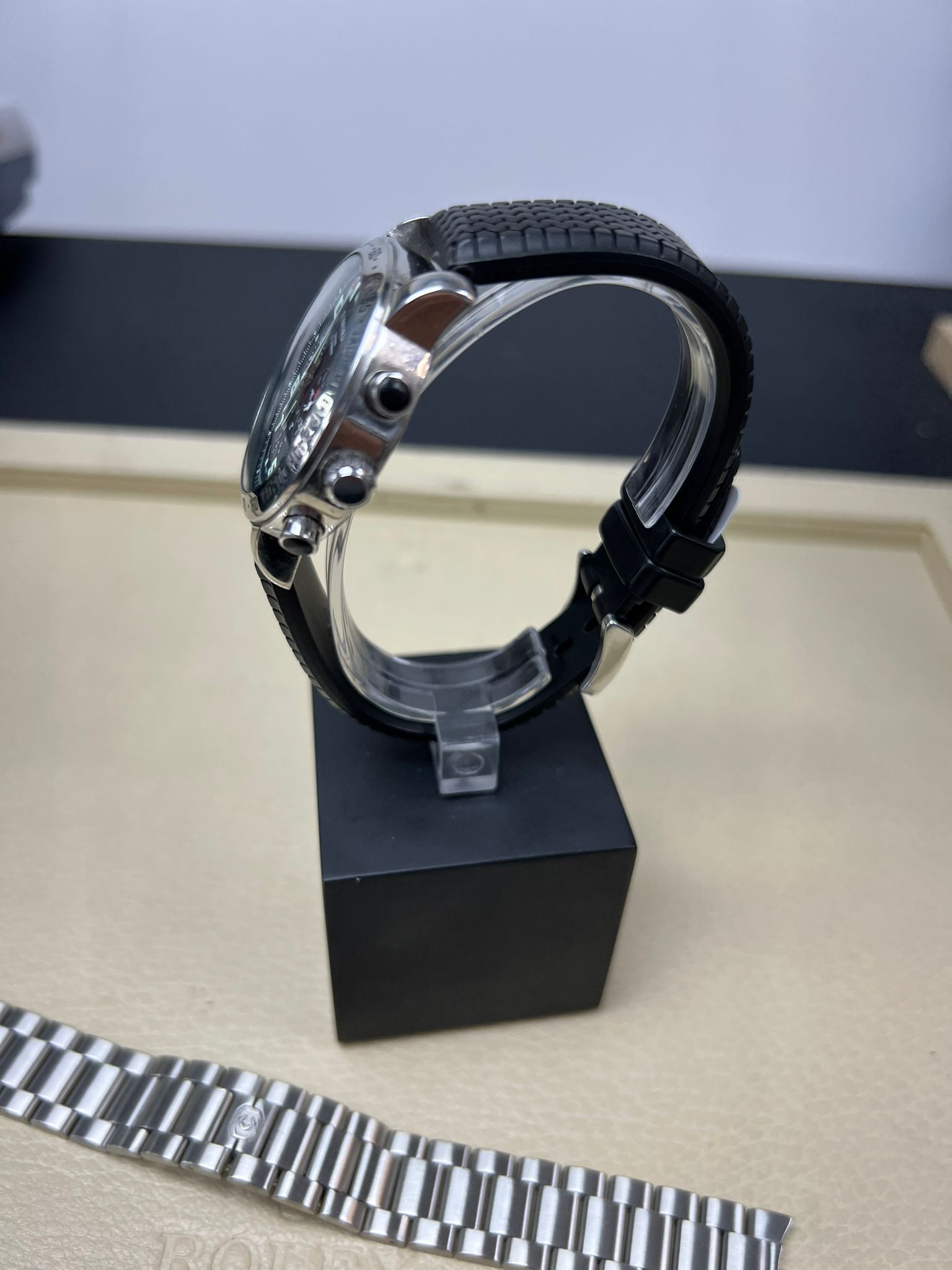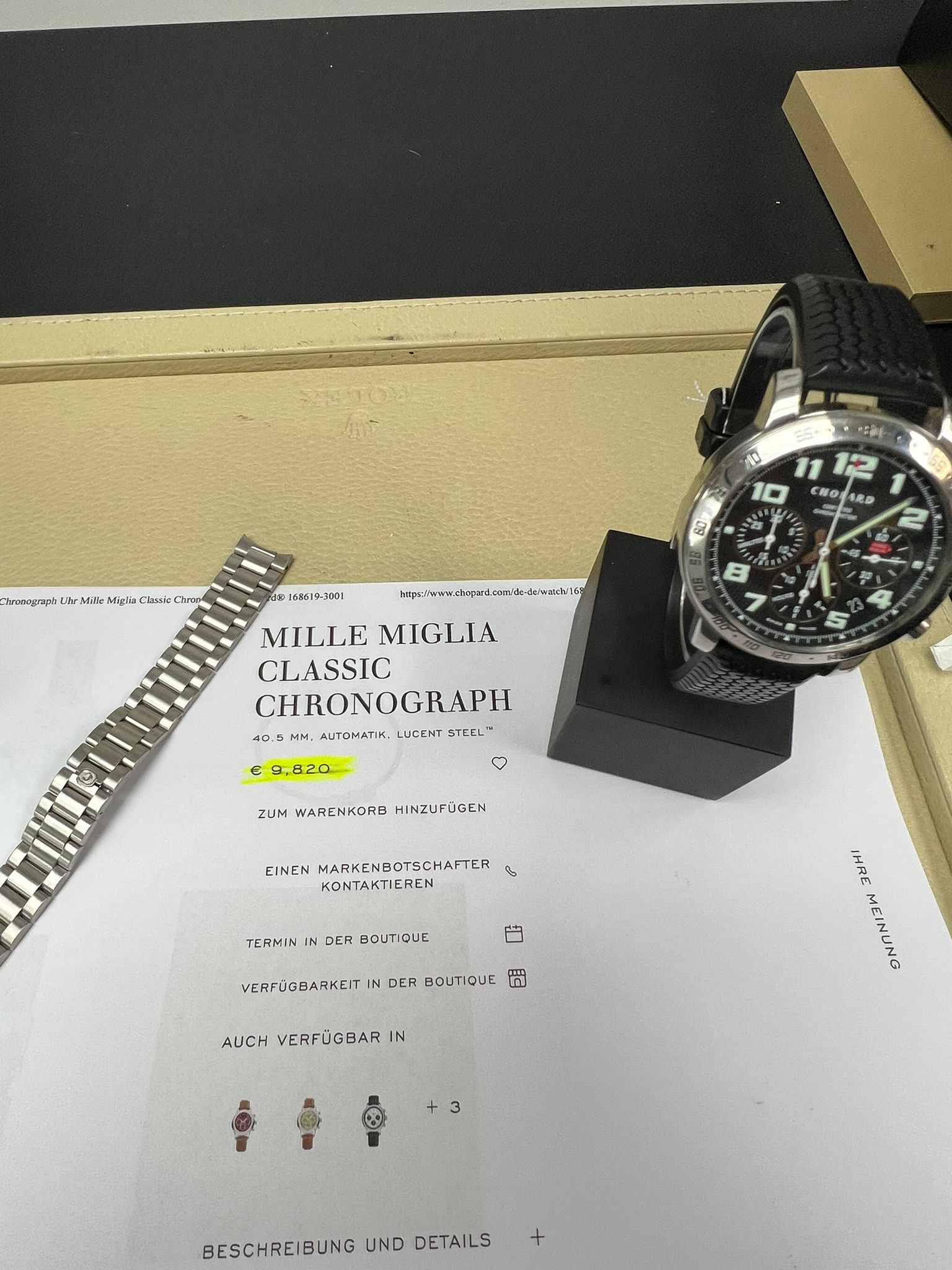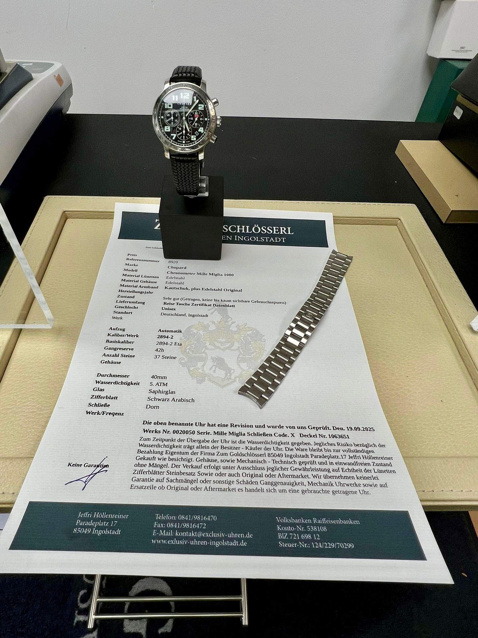 Gehäuse.Edelstahl, Lünette. Edelstahl, 2x Originale Armbänder 1x Kautschuk 1 x Edelstahl, Baujahr. Ref.8920 Serie.Mille Miglia 1000 Automatik, Kaliber. 2894-2 Eta Steine.37, Gangreserve, 42h Stunden,Wasserdichtigkeit.5.ATM :Durchmesser:40 mm, die uhr hat eine Revision erhalten und wurde von uns Geprüft, Zeitwaage, Justiert, Wassrdichtigkeit,Lieferumfang:Echtheitszertifiat, Datenblatt alle relevanten Daten dokumentiert NP. 9.820.-€ Preis. 2.950.-€