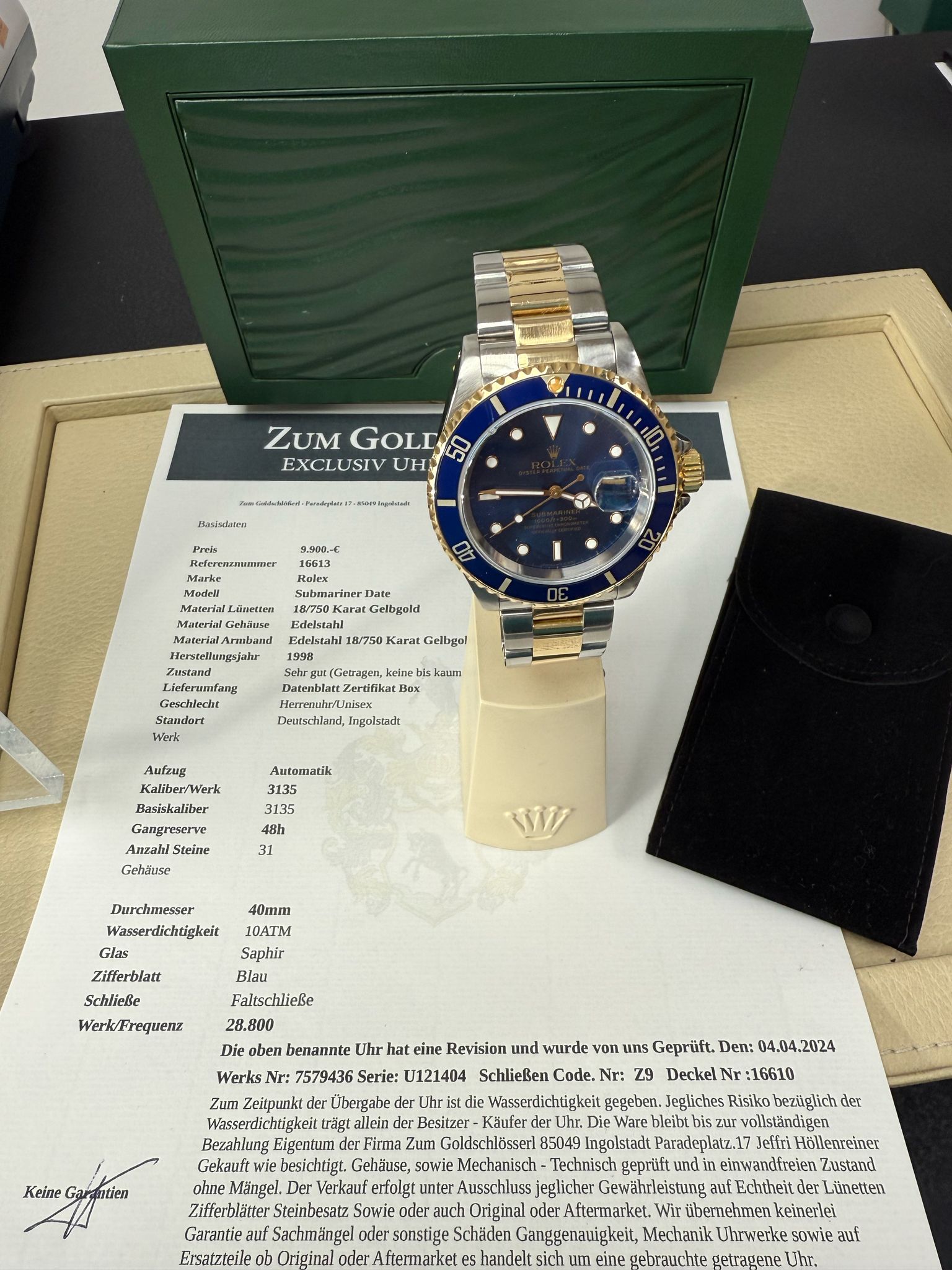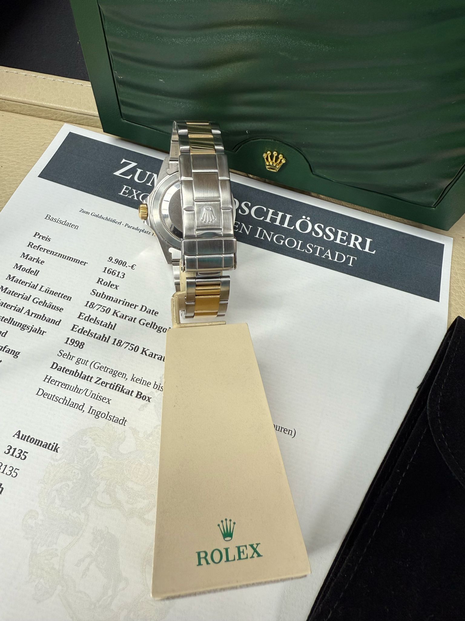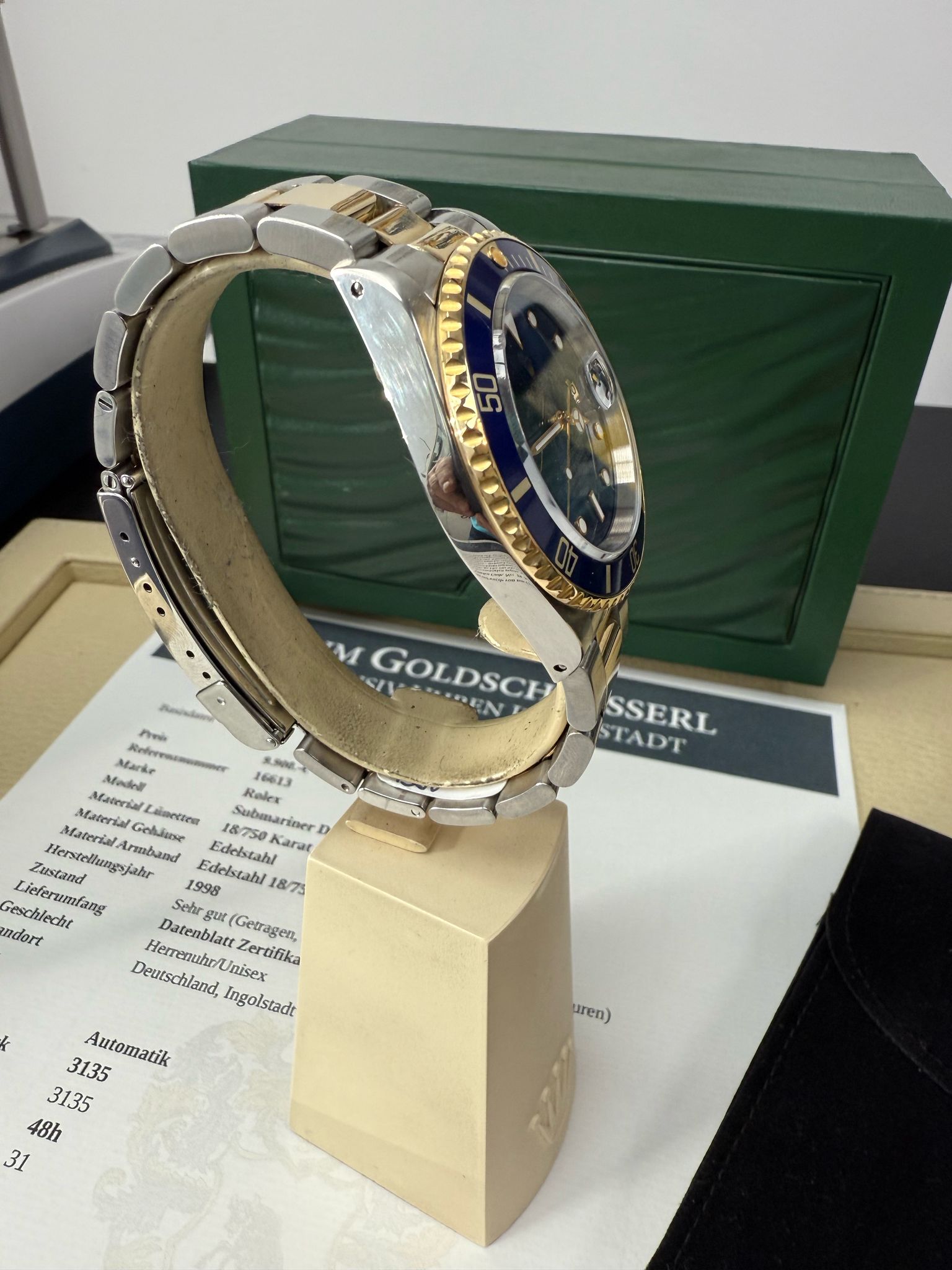 Gehäuse: Edelstahl Lünette:Gelbgold 18 /750 Karat Armband: Edelstahl / Gelbgold 18/ 750 Karat Baujahr:1998 Ref: 16613 Serie: Uxx ,Automatik: Kaliber:3135 Basis Kaliber 3135 Gangreserve: 48h, Durchmesser: 40mm, die Uhr hat 1x Revision erhaltern und wurde von uns Geprüft alle relevanten Daten dokumentiert Box Echtheitszertifiat, Datenblatt Preis: 9.900 .-€