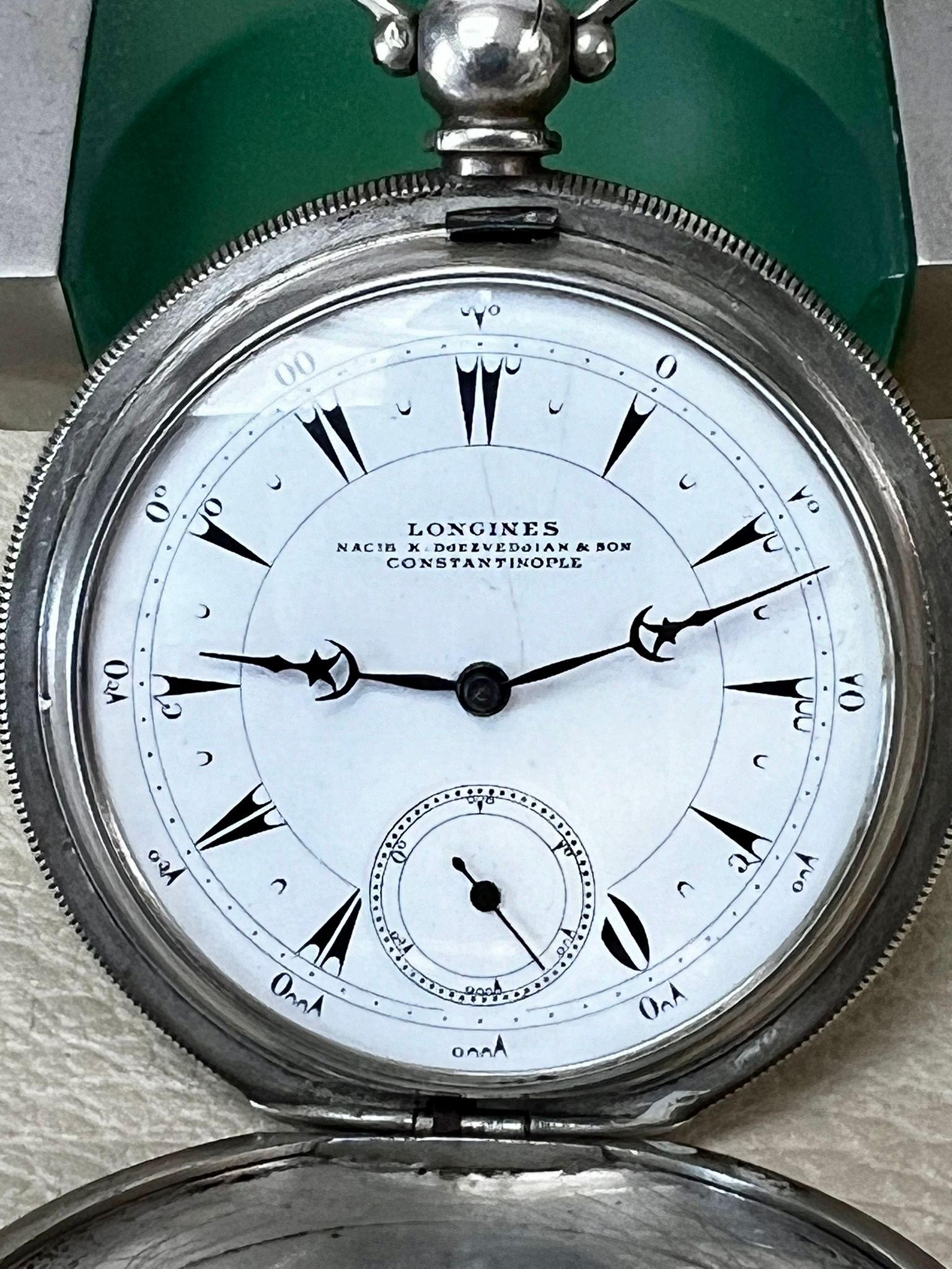 Gehäuse:800 Silber. Zylinderwerk für Schlüsselaufzug. Baujahr Ca 1915/ 1920 Nr. 3649528 Emailzifferblatt bezeichnung. Longines Nacib K Djezvedjian 2. Son Constantinoble, mit Arabische Stundenkeile, Sprungdeckel,Graviertes Gehäuse Nr. xxxx Durchmesser:ca.51mm, Gesamt Gewicht. Ca. 100 gramm Ziffernblatt, Email weiß, Ziffernblatt: Arabische Zahlen, Zeiger: Louis xv, kleine Sekunde, Zustand: funktionstüchtig, keine Garantie auf Ganggenauigkeit, siehe Fotos Preis: 1.200.-€
