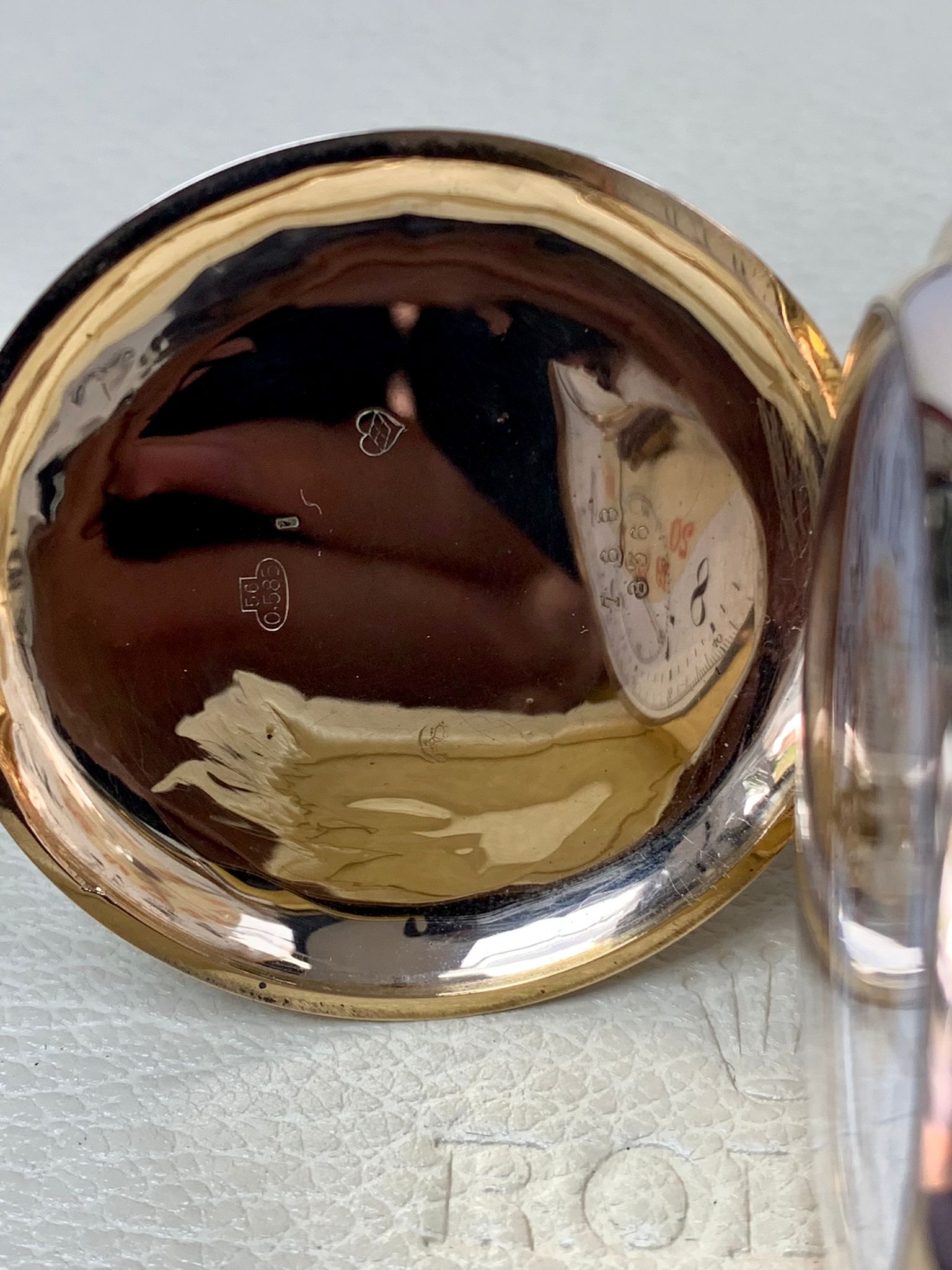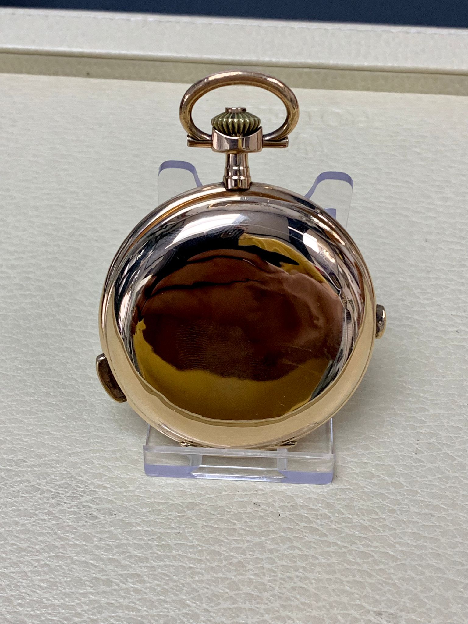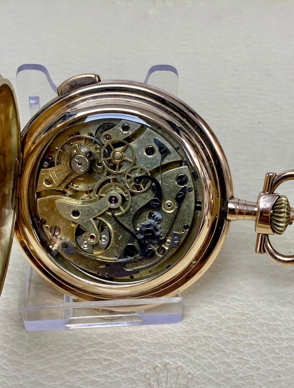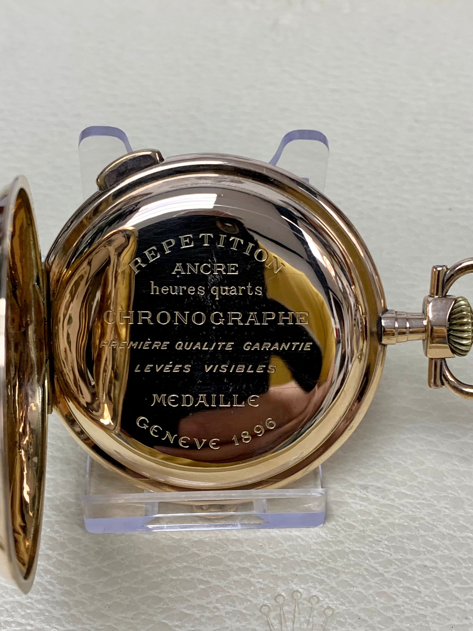 Hersteller: Ancre Heures Gravur auf dem deckel Werkdeckel. hier steht Quarts Chronographe Premiere Qualite Garantie Leves Vilsibles Medaille 1896 Geneve Funktioin: 1 Stunden, Viertelstunden Repetition großer Drücker auf der 7 uhr mit einen wunder schönen Ton, plus stop Funktion kleiner drücker auf der 12 Uhr Baulahr: ca 1896 / 1900 Gehäuse: 14/585 Karat Gold Gewicht: 109 Gramm, Handaufzug, Durchmesser: 59,4mm, Ziffernblatt: Email weiß, Ziffernblatt: Arabische Zahlen, Zeiger: Louis xv Form, kleine Sekunde,plus stopp funktion, Zustand: gereinigt, funktionstüchtig, siehe Fotos alle drei deckel, Aussen,Innendeckel Staubdeckel,sind Punziert mit Karat 585/14 Karat und mit Marken Hersteller Punzierung keine Garantie auf die Ganggenauigkeit Revision neu Preis: 4.650.-€