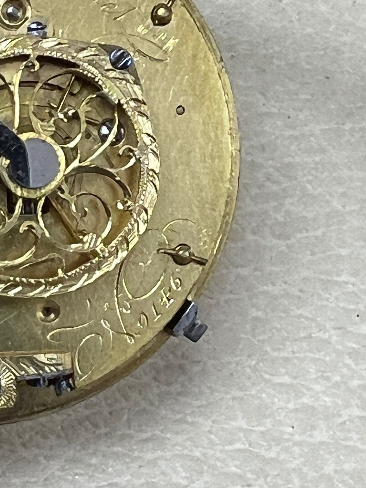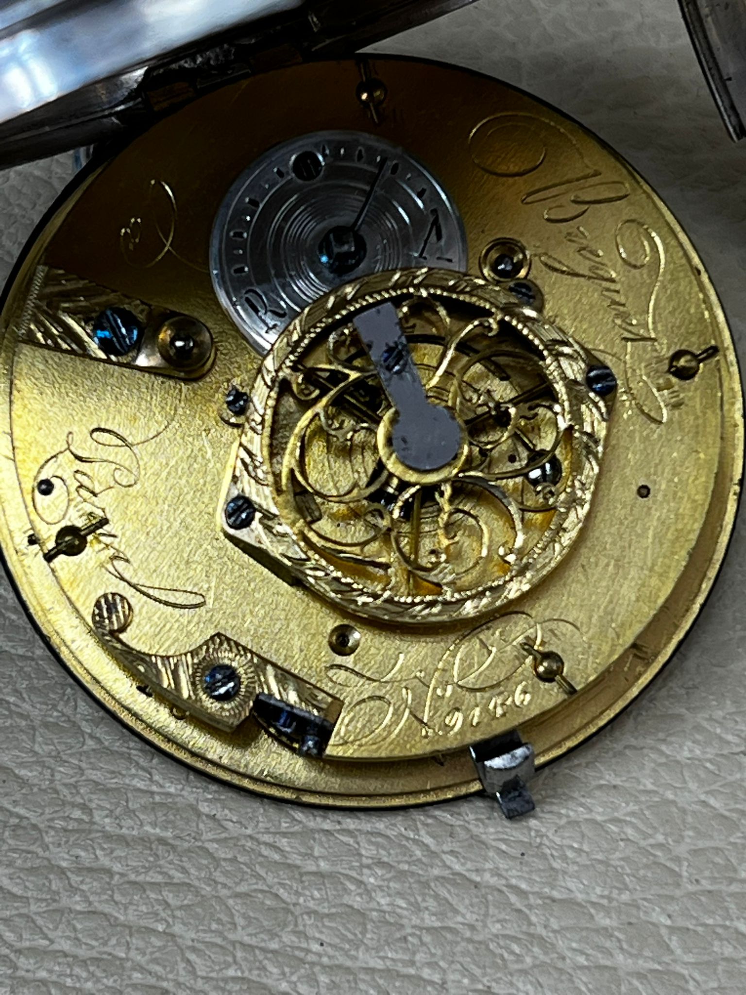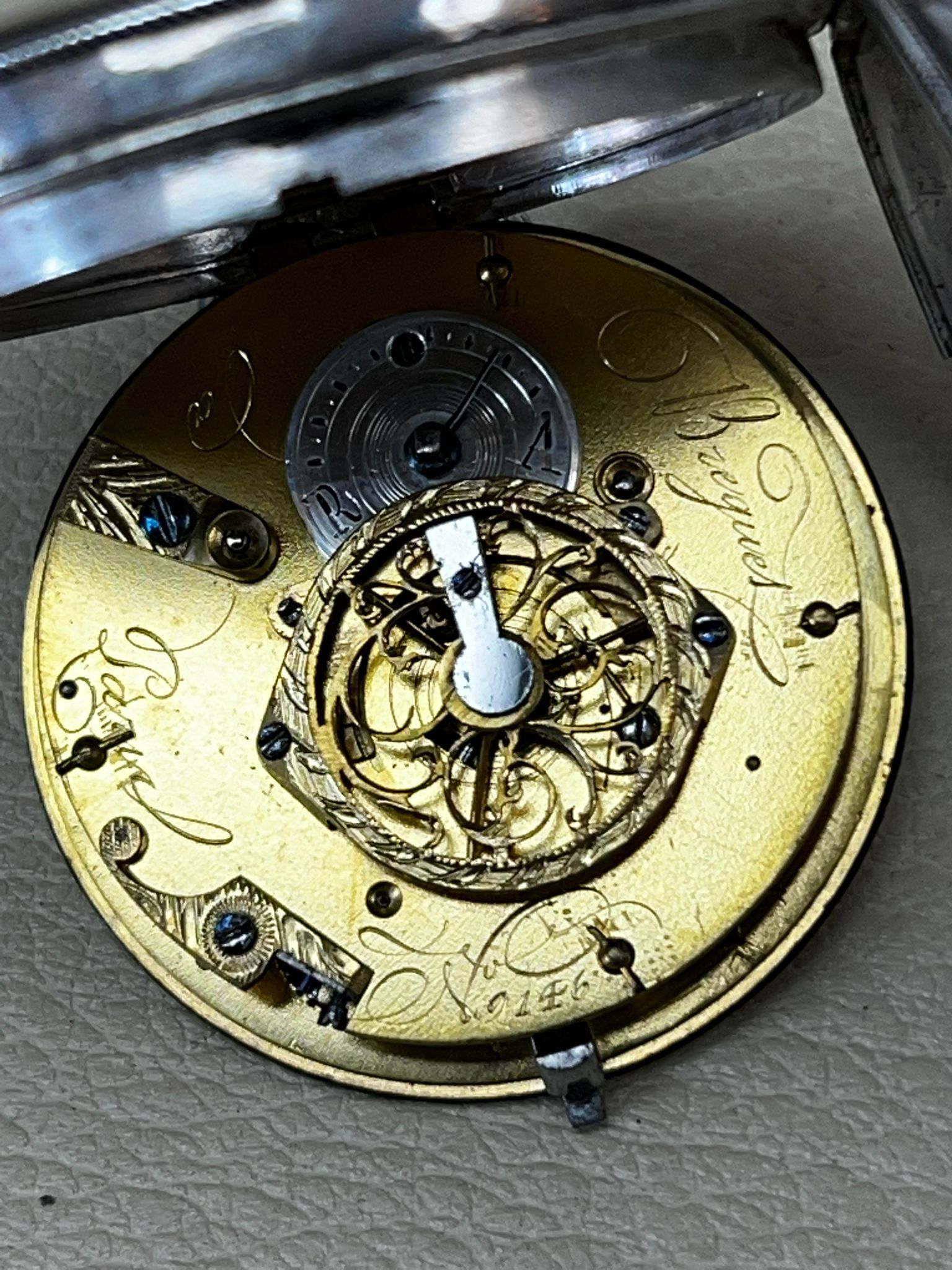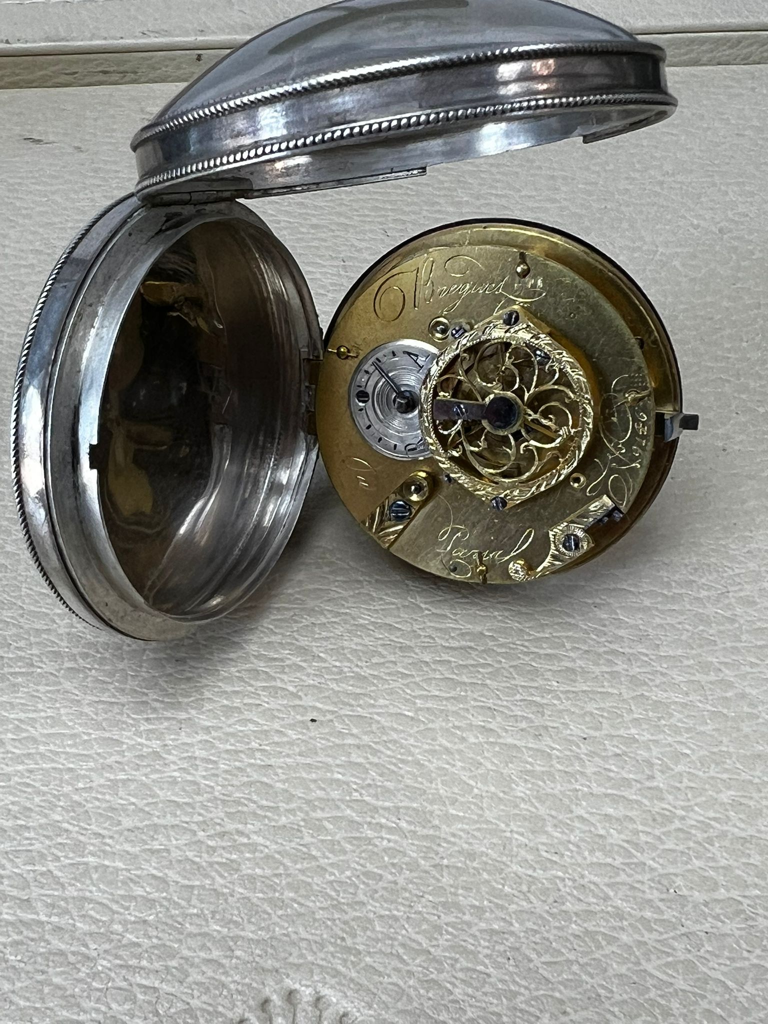 Gehäuse:Silber, Die Uhr hat ein Spindeluhrwerk mit Schlüsselaufzug, die Werks Nr. 91xx der Deckel im Gehäuse Innen hat die Nr. 32xx Die Uhr ist Funktionstüchtig. Der Aufzugs Schlüssel ist anbei das Weiße Emaillierte Zifferblatt ist bschädigt das Gehäuse ist im alters bedingten Zustand.Das Silberne Gehäuse ist innen Graviert mit Uhrmacher Punzen der Bügel der Taschenuhr ist mit 18 Gepunzt die Spindelhemmung die um 1800 ihren Zenit überschritten hat und sukzessive von Zylindser und in der folge der Ankerhhemmung verdrängt wurde um die gebräuchliche Hemmung zu nennen. Die letzten ihrer Art wurden grob um 1850 gebaut. Das uhrwerk ist eindeutig europäisch kontinentalen Ursprungs. Silberpunzen gab es noch nicht aber das Gehäuse ist sicherlich aus Silber.Durchmesser: Ca 55mm Gesamt Gewicht Ca.109 Gramm Zustand: Funktionstüchtig, keine Garantie auf Ganggenauigkeit, siehe Fotos, Preis: 2.150.-€