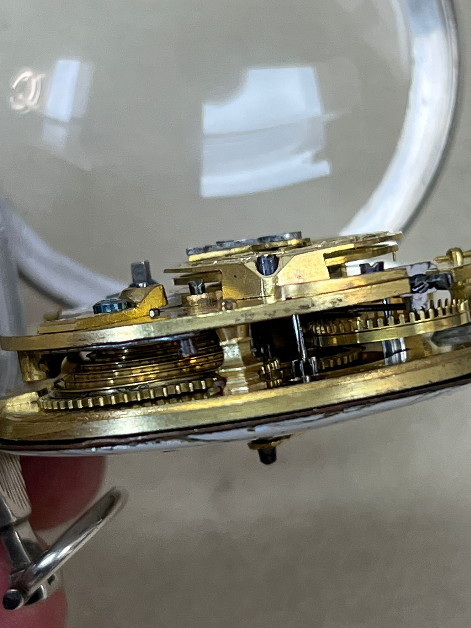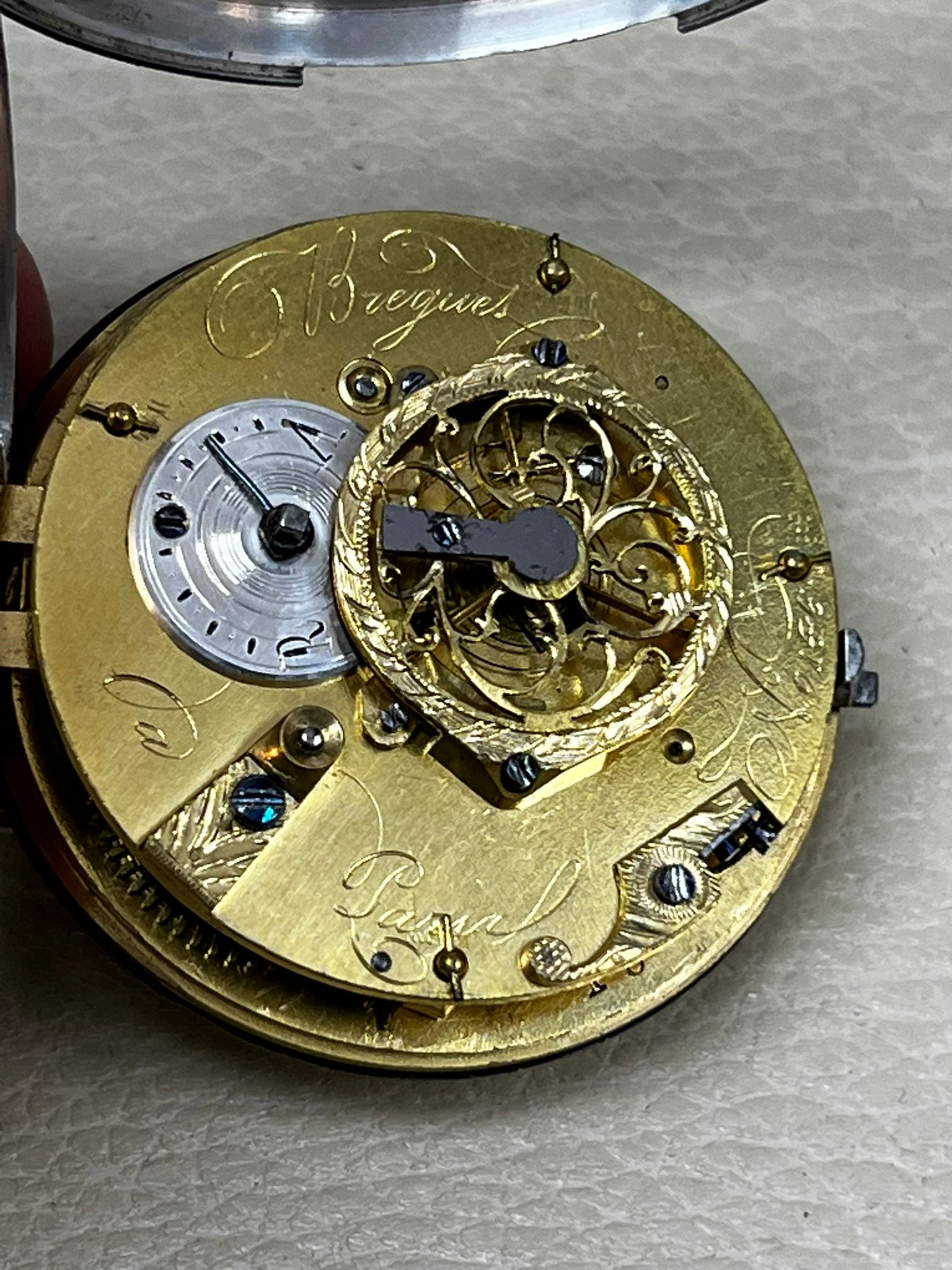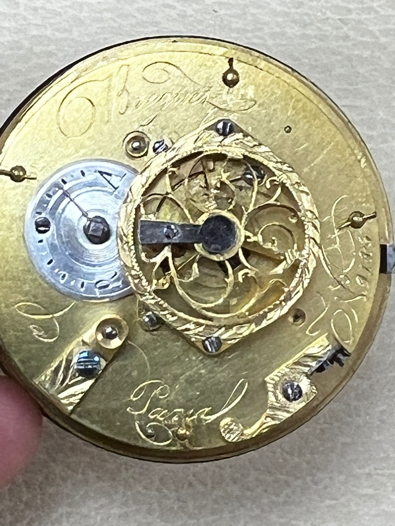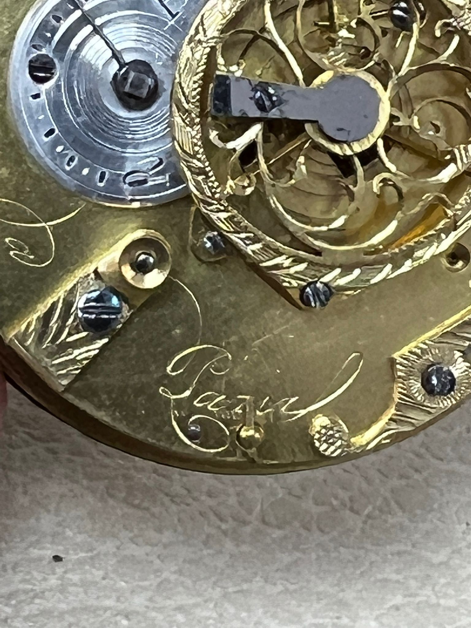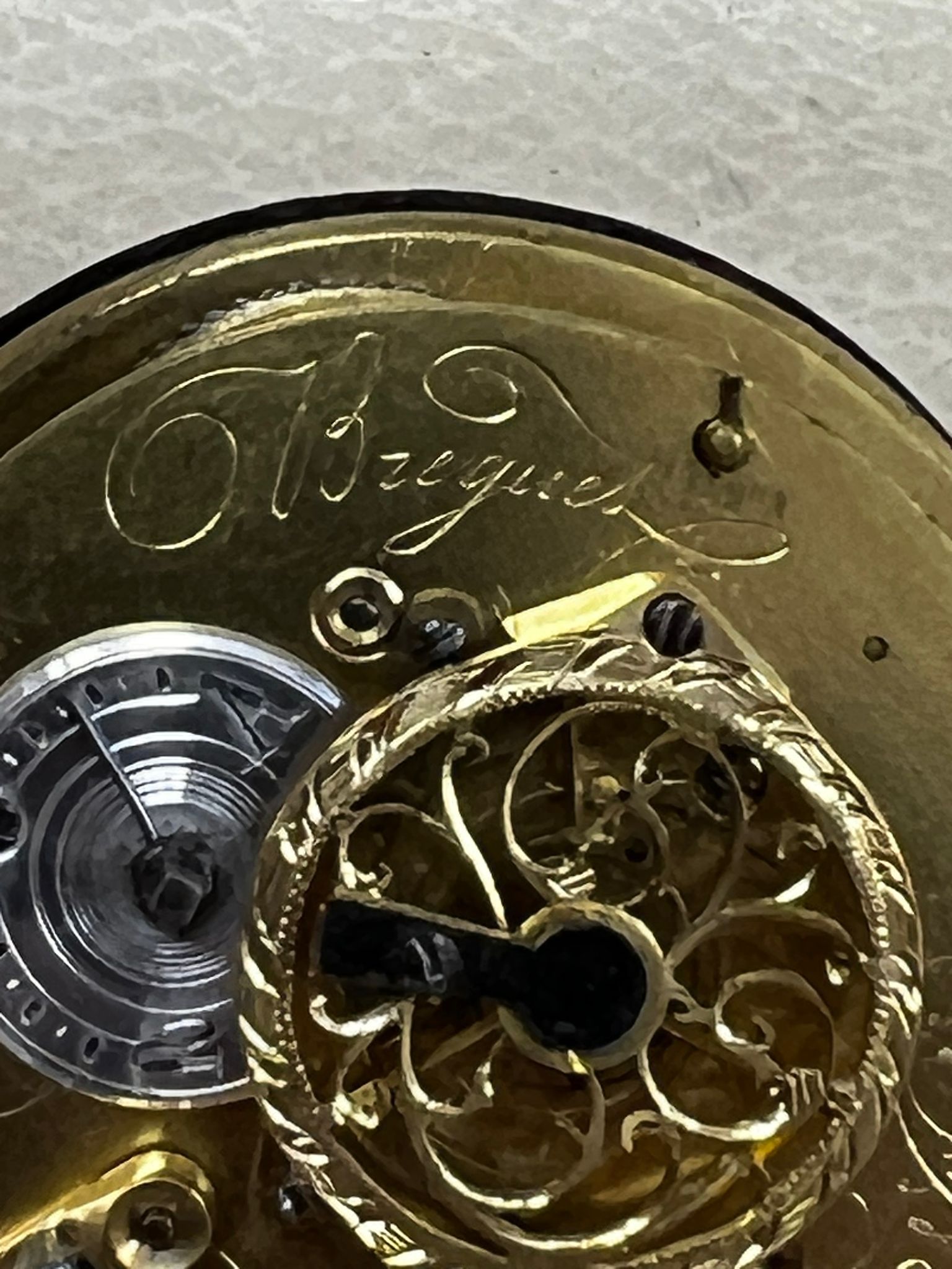 Gehäuse:Silber, Die Uhr hat ein Spindeluhrwerk mit Schlüsselaufzug, die Werks Nr. 91xx der Deckel im Gehäuse Innen hat die Nr. 32xx Die Uhr ist Funktionstüchtig. Der Aufzugs Schlüssel ist anbei das Weiße Emaillierte Zifferblatt ist bschädigt das Gehäuse ist im alters bedingten Zustand.Das Silberne Gehäuse ist innen Graviert mit Uhrmacher Punzen der Bügel der Taschenuhr ist mit 18 Gepunzt die Spindelhemmung die um 1800 ihren Zenit überschritten hat und sukzessive von Zylindser und in der folge der Ankerhhemmung verdrängt wurde um die gebräuchliche Hemmung zu nennen. Die letzten ihrer Art wurden grob um 1850 gebaut. Das uhrwerk ist eindeutig europäisch kontinentalen Ursprungs. Silberpunzen gab es noch nicht aber das Gehäuse ist sicherlich aus Silber.Durchmesser: Ca 55mm Gesamt Gewicht Ca.109 Gramm Zustand: Funktionstüchtig, keine Garantie auf Ganggenauigkeit, siehe Fotos, Preis: 2.150.-€