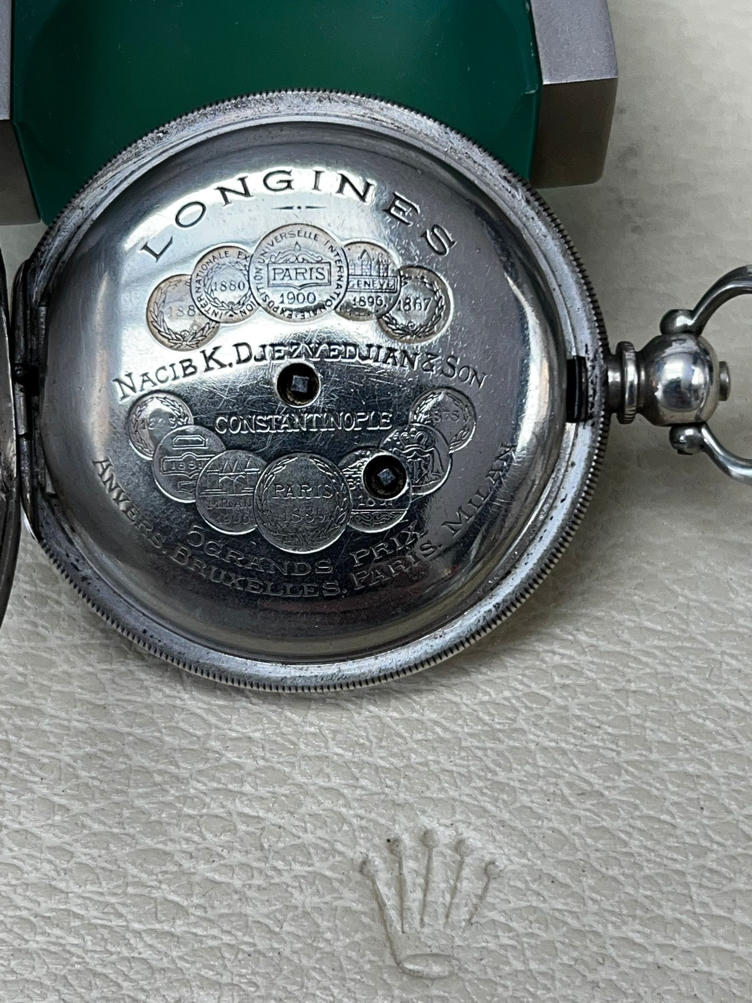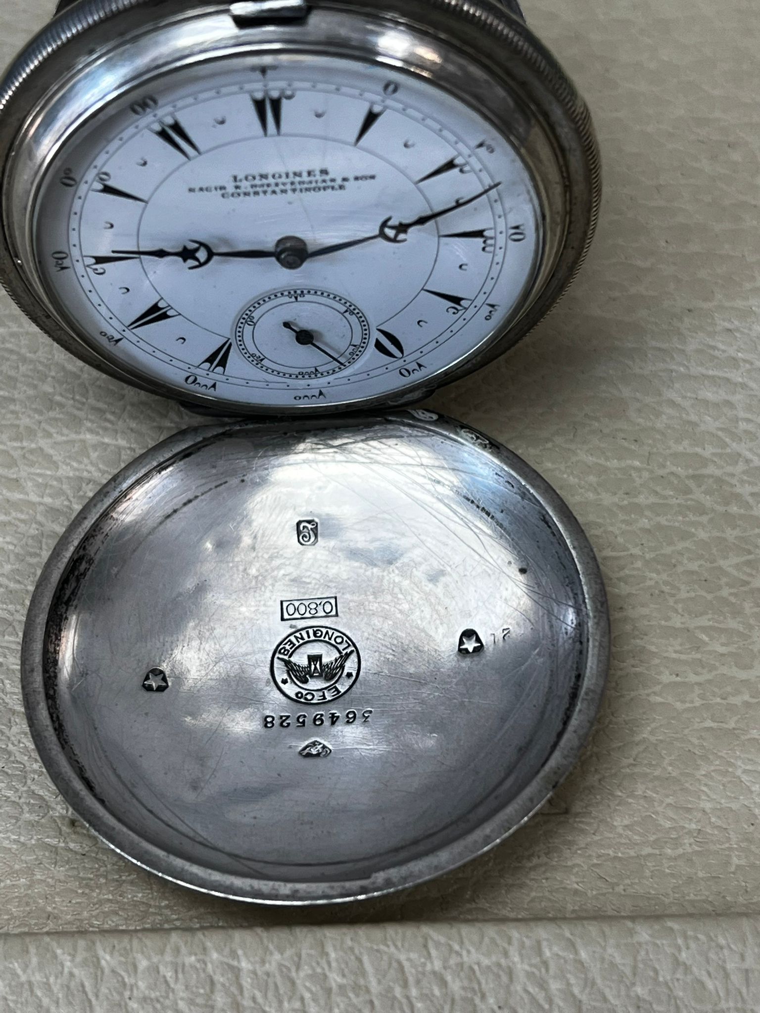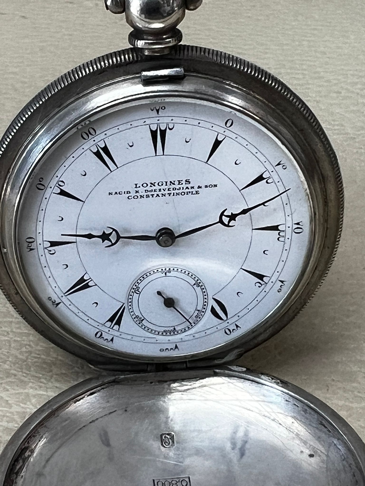 Gehäuse:800 Silber. Zylinderwerk für Schlüsselaufzug. Baujahr Ca 1915/ 1920 Nr. 3649528 Emailzifferblatt bezeichnung. Longines Nacib K Djezvedjian 2. Son Constantinoble, mit Arabische Stundenkeile, Sprungdeckel,Graviertes Gehäuse Nr. xxxx Durchmesser:ca.51mm, Gesamt Gewicht. Ca. 100 gramm Ziffernblatt, Email weiß, Ziffernblatt: Arabische Zahlen, Zeiger: Louis xv, kleine Sekunde, Zustand: funktionstüchtig, keine Garantie auf Ganggenauigkeit, siehe Fotos Preis: 1.200.-€