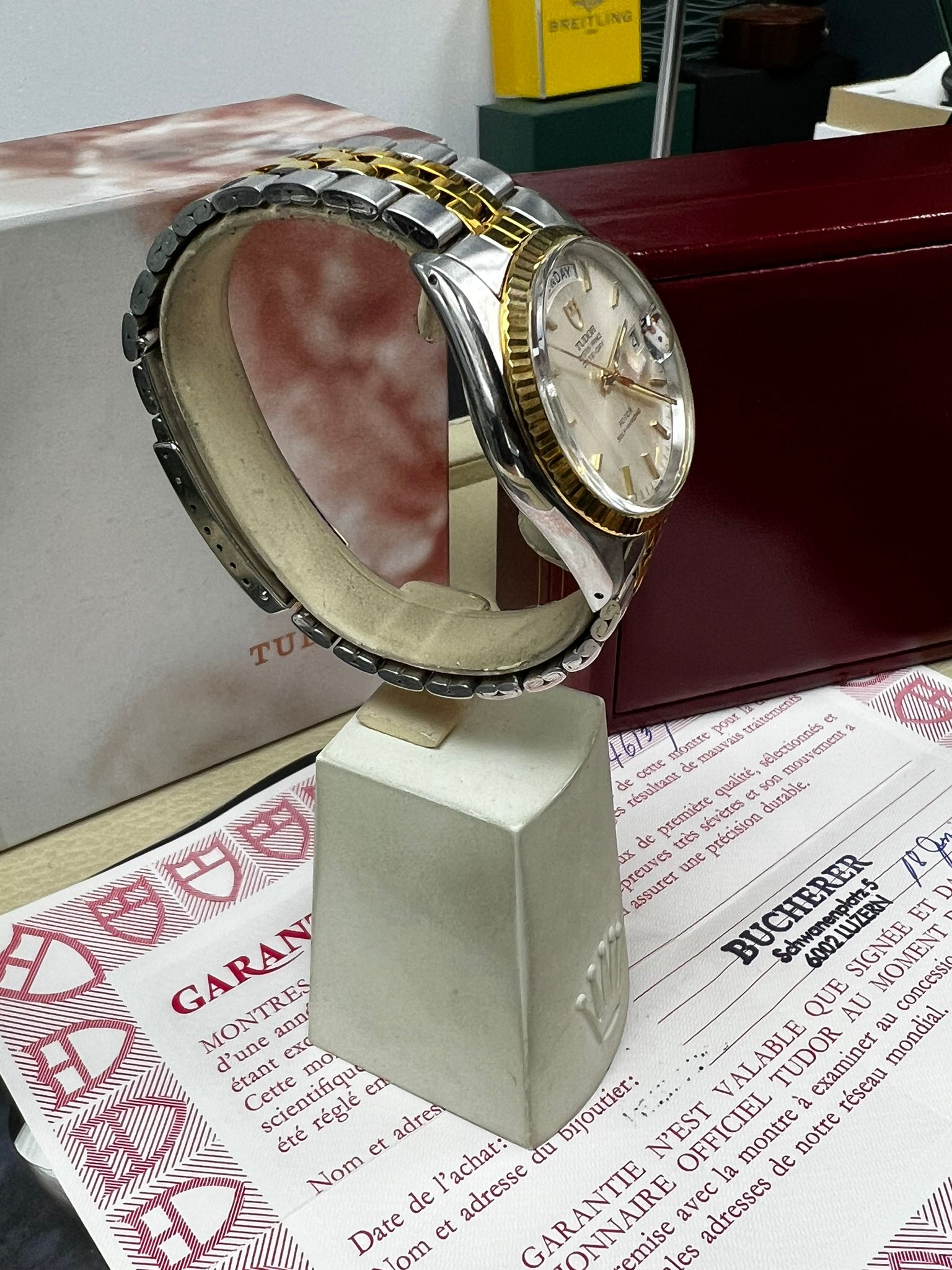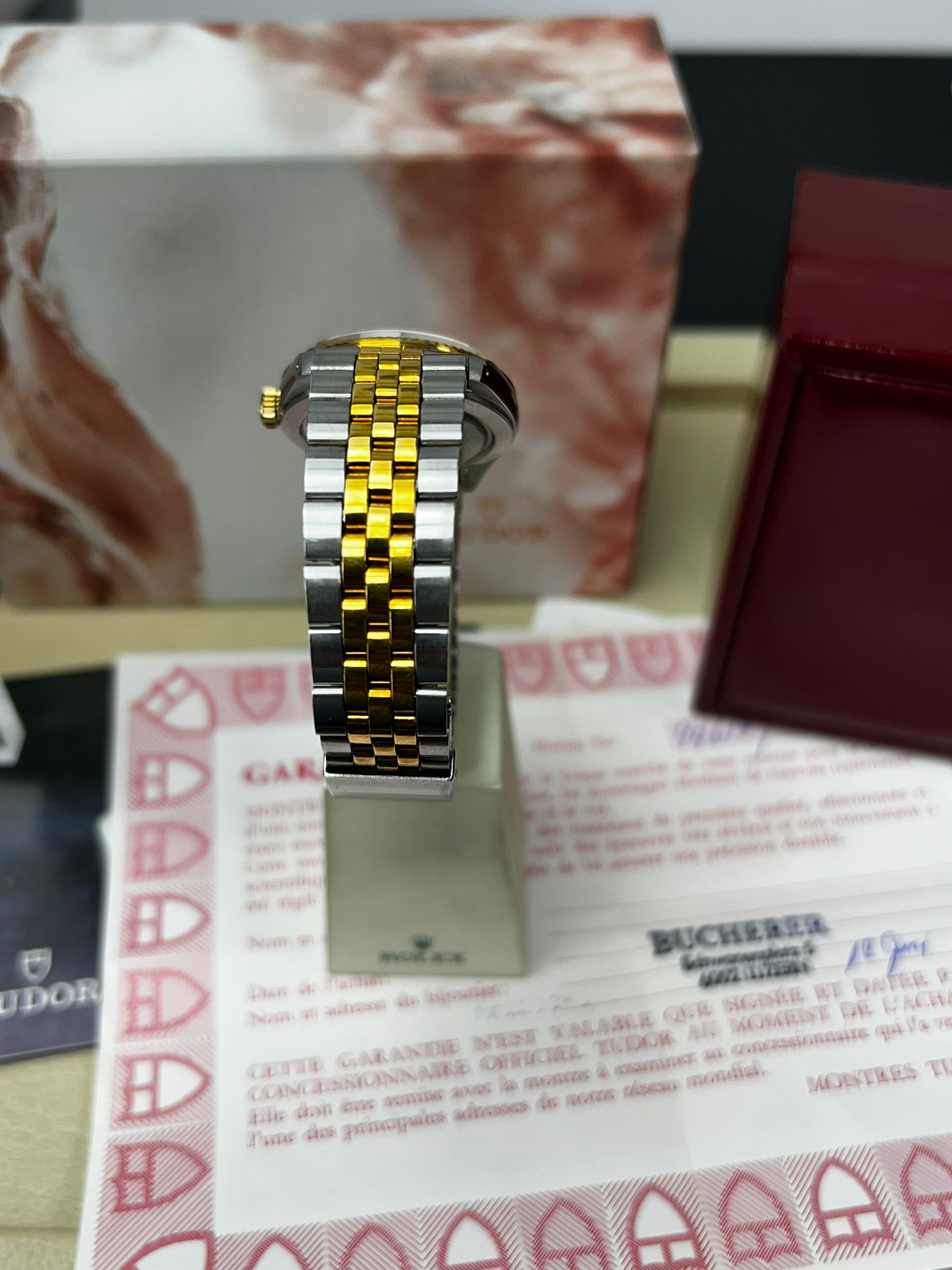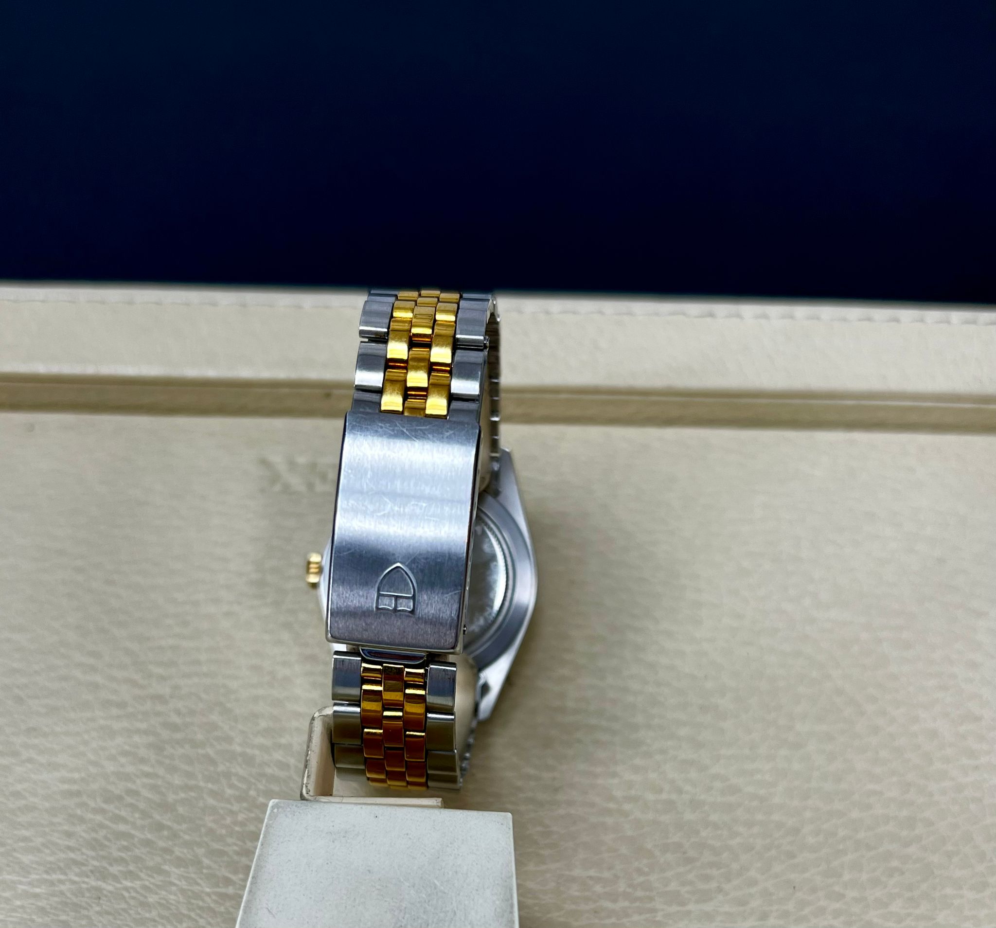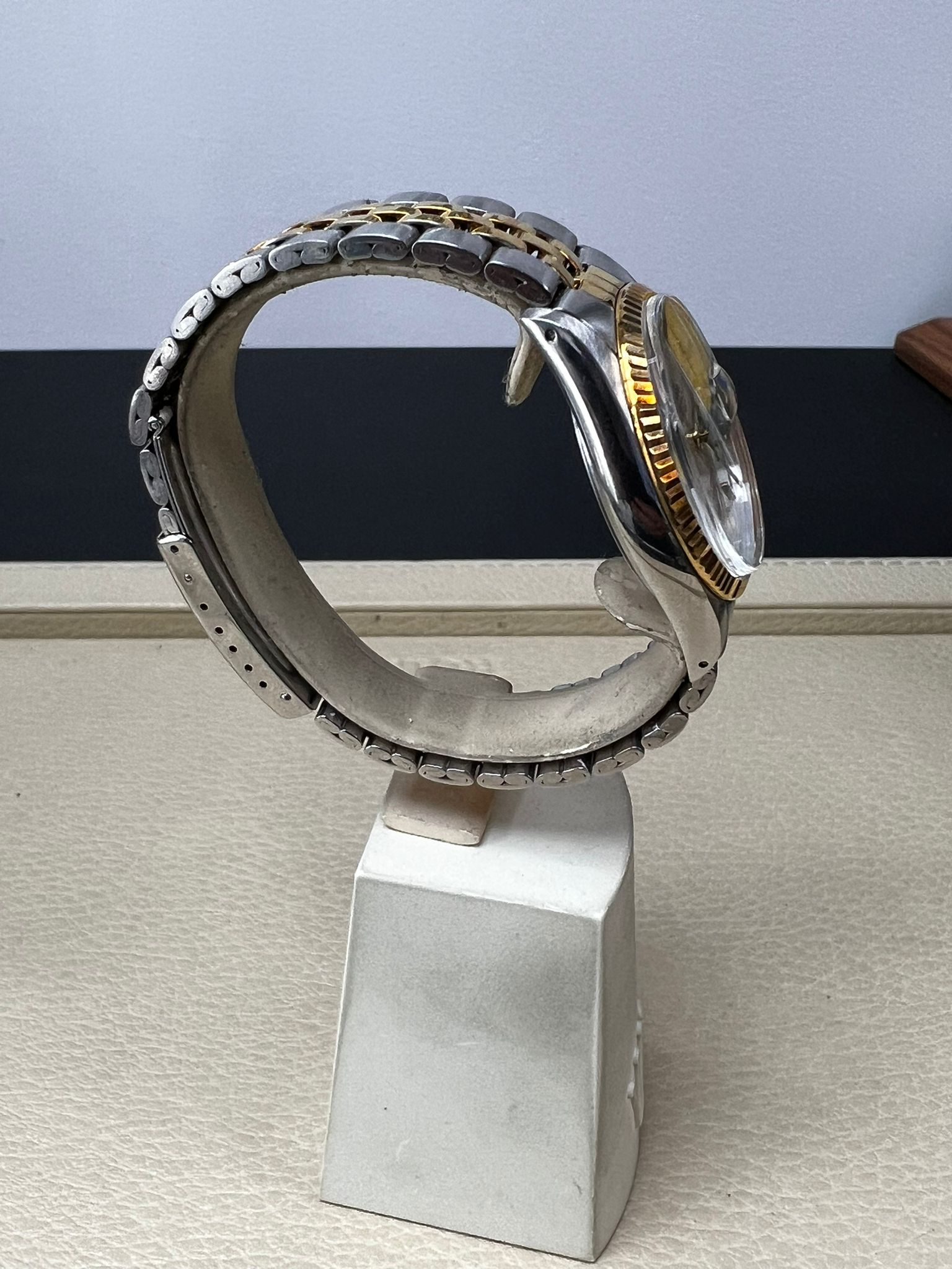 Gehäuse.Edelstahl Lünette. 18/750 Karat Gelbgold Armand. Edelstahl Baujahr. 18.06.1990 Referenz Nr. 94613 Serie. DayDate Kaliber. 2834-2 Eta 40h Gangreserve Durchmesser. 36mm alle relevanten Daten dokumentiert. Lieferumfang. Box,überbox, Booklet, Ledermäppchen,Garantieheft, Zertifikat, Dattenblatt Preis. 3.450.-€